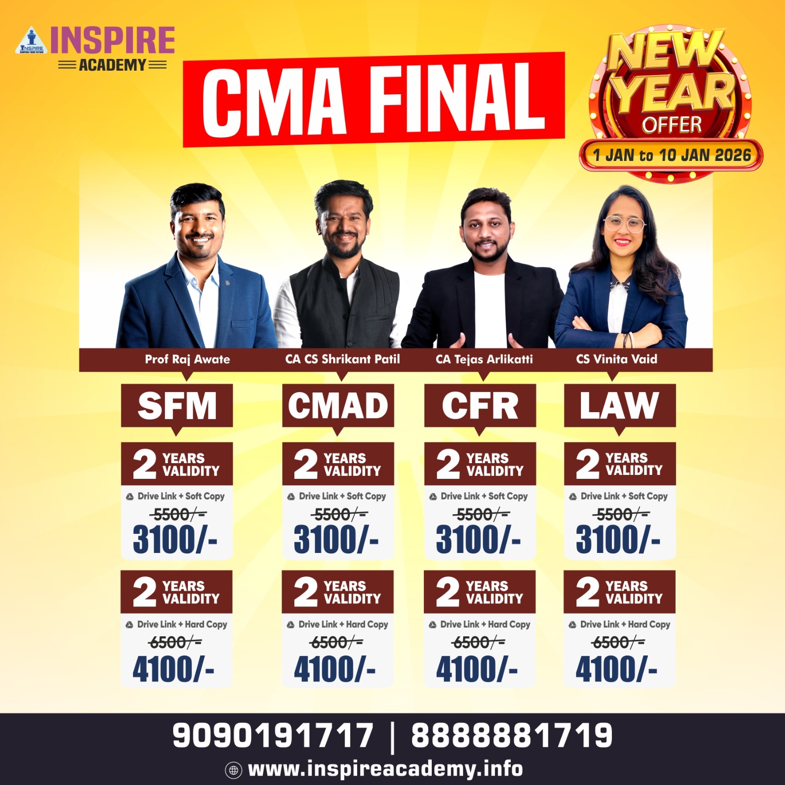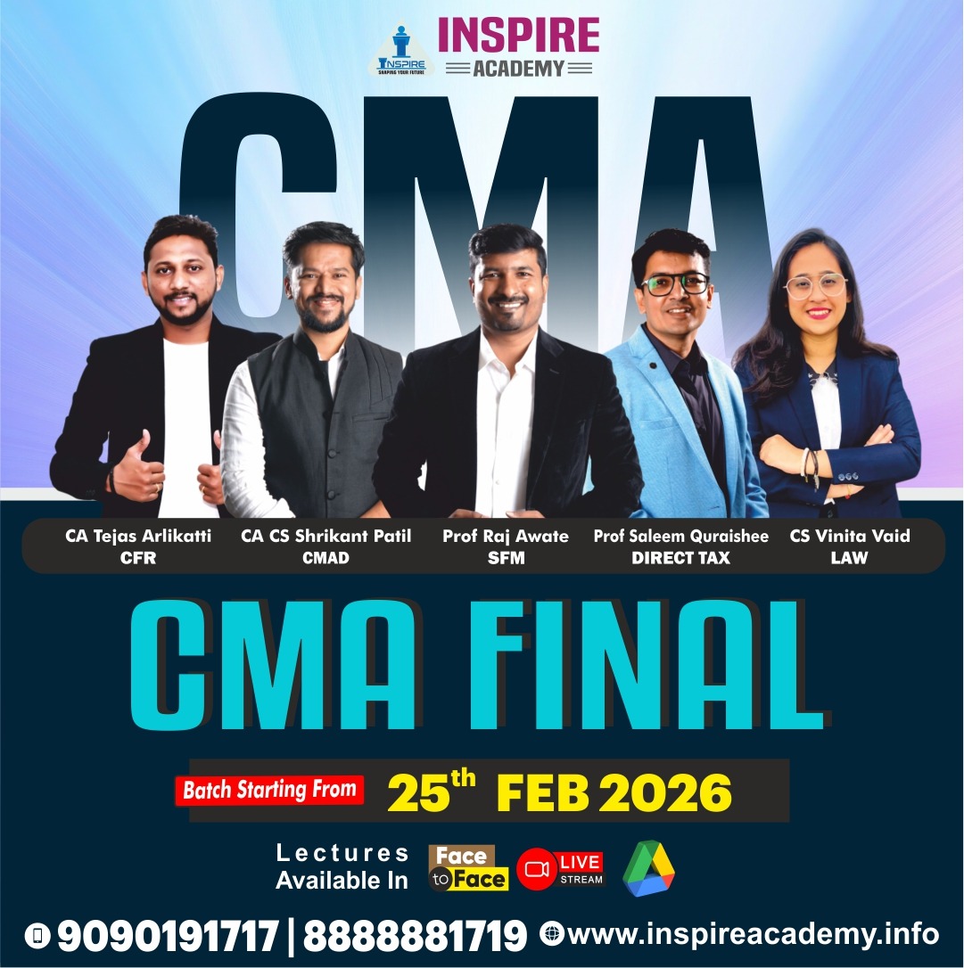 Looking to advance your career in Cost and Management Accounting? Inspire Academy offers expert coaching and guidance for CMA Final Course students across India. Whether you’re preparing for your CMA Final exams or seeking professional mentorship, we provide comprehensive resources to ensure your success.
