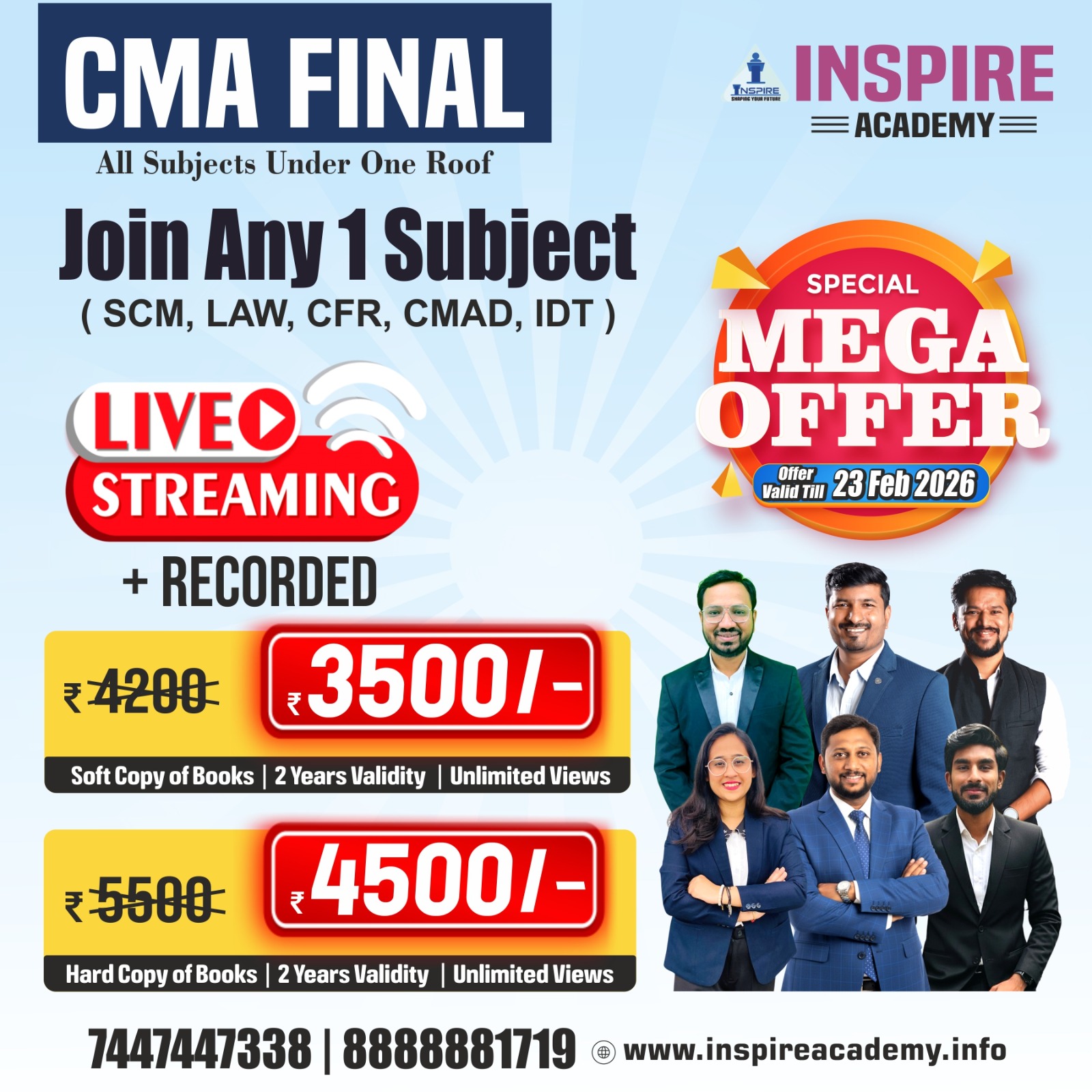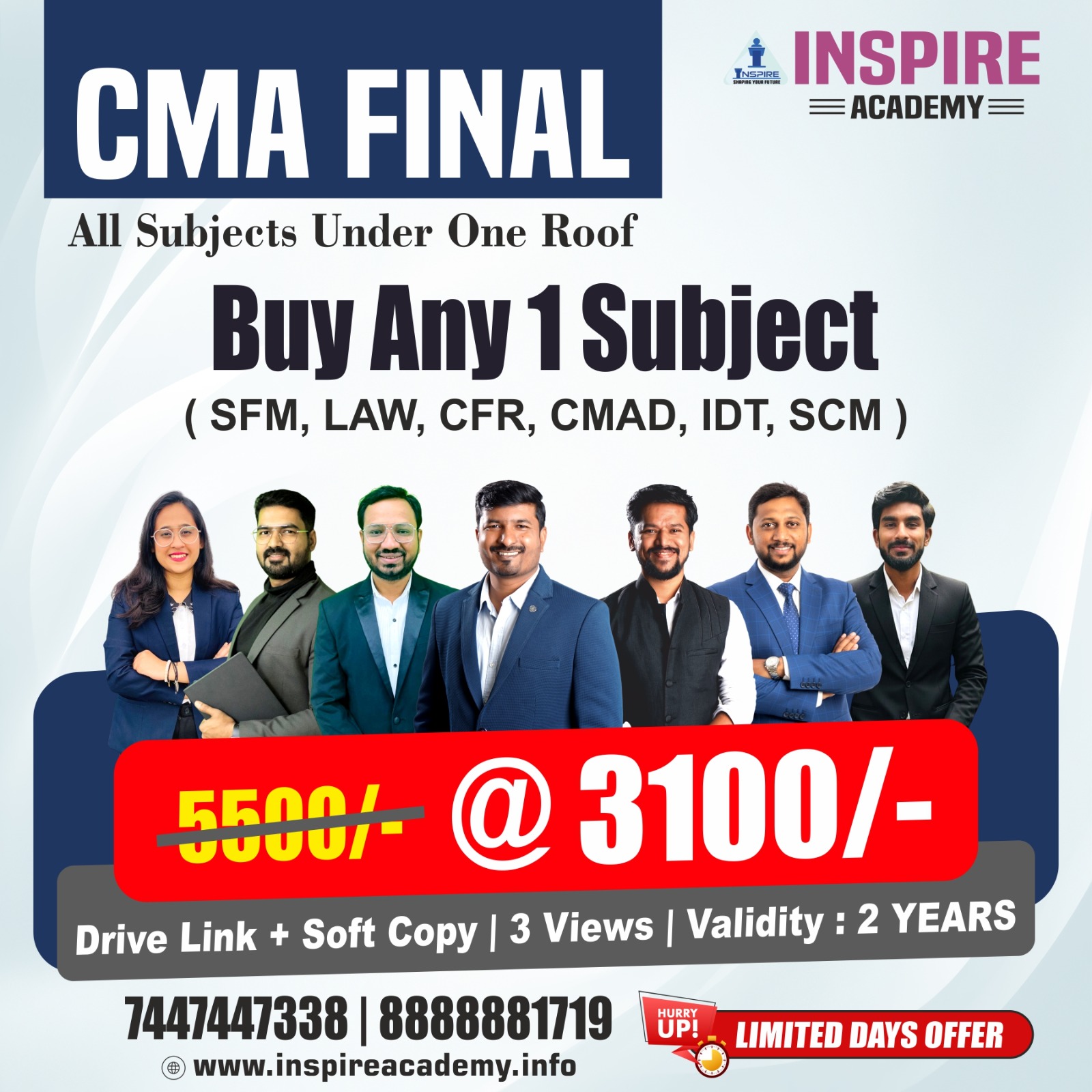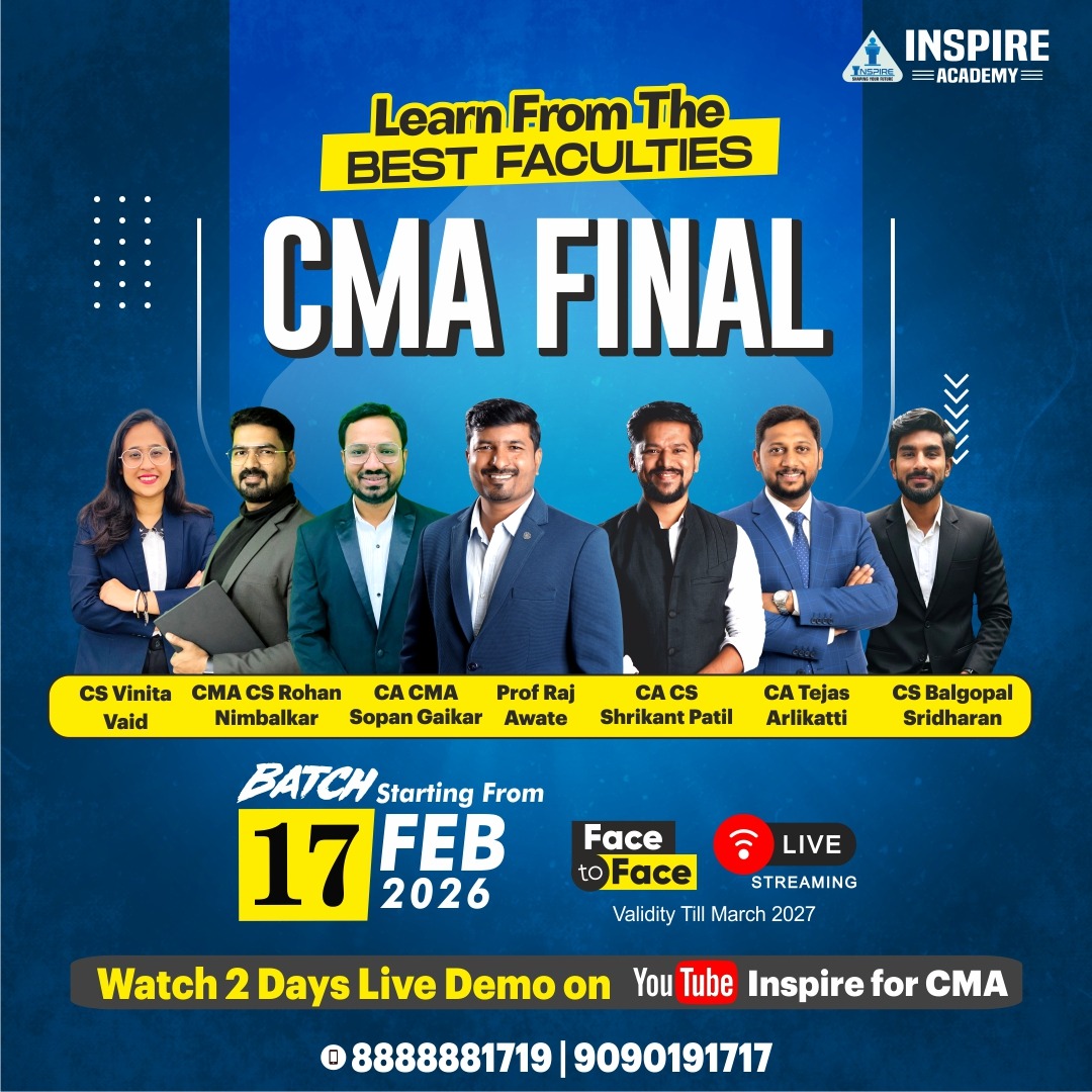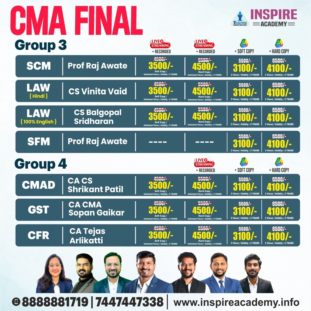 Upon registration, you will receive the CMA Final study material from Inspire Academy. We provide both hard copies and online resources based on your preference.
