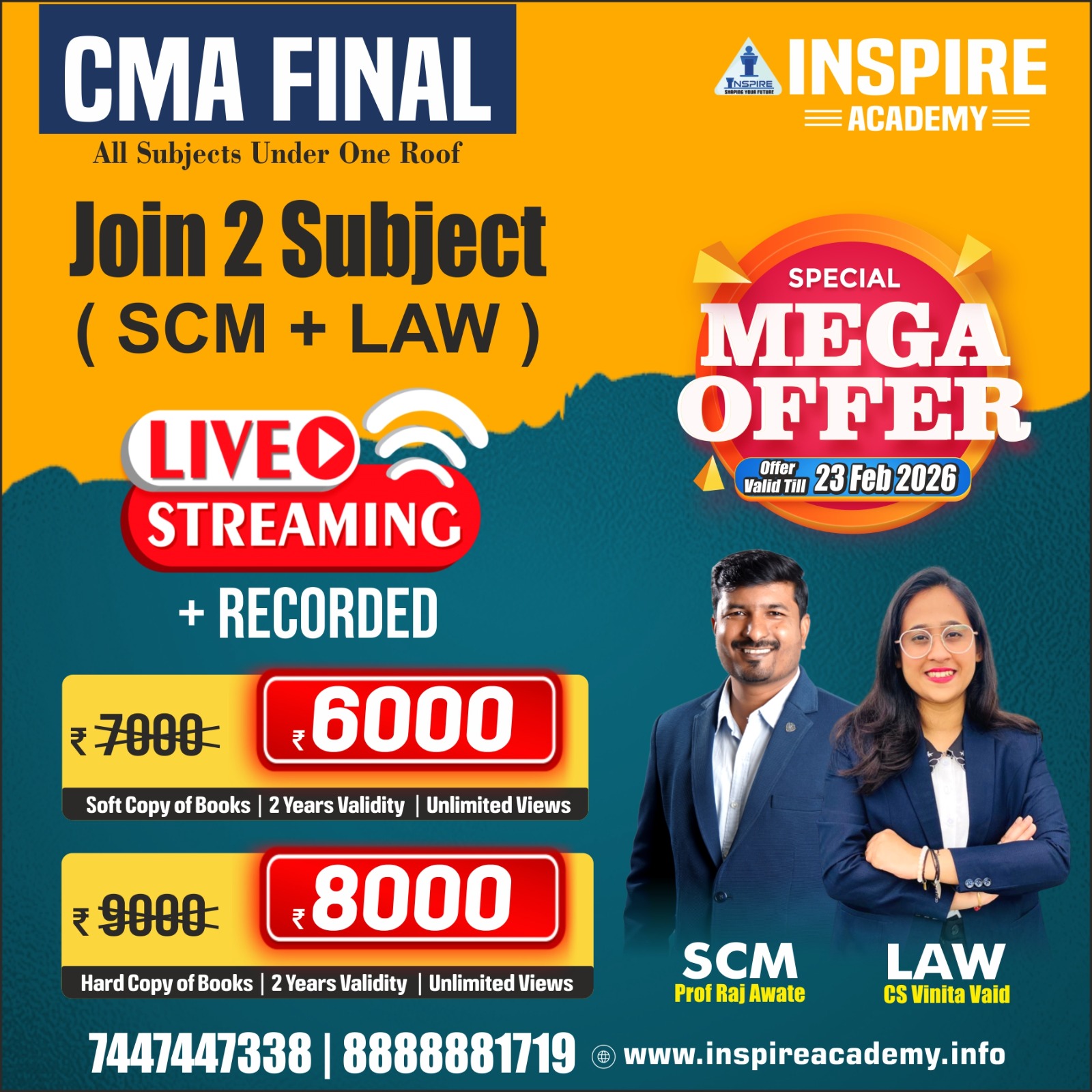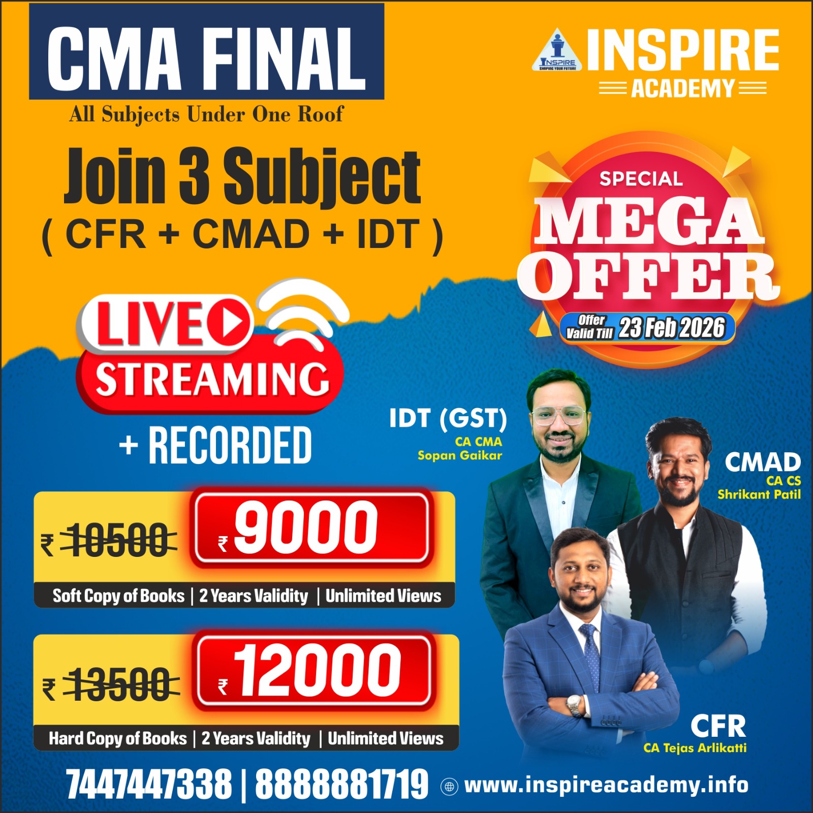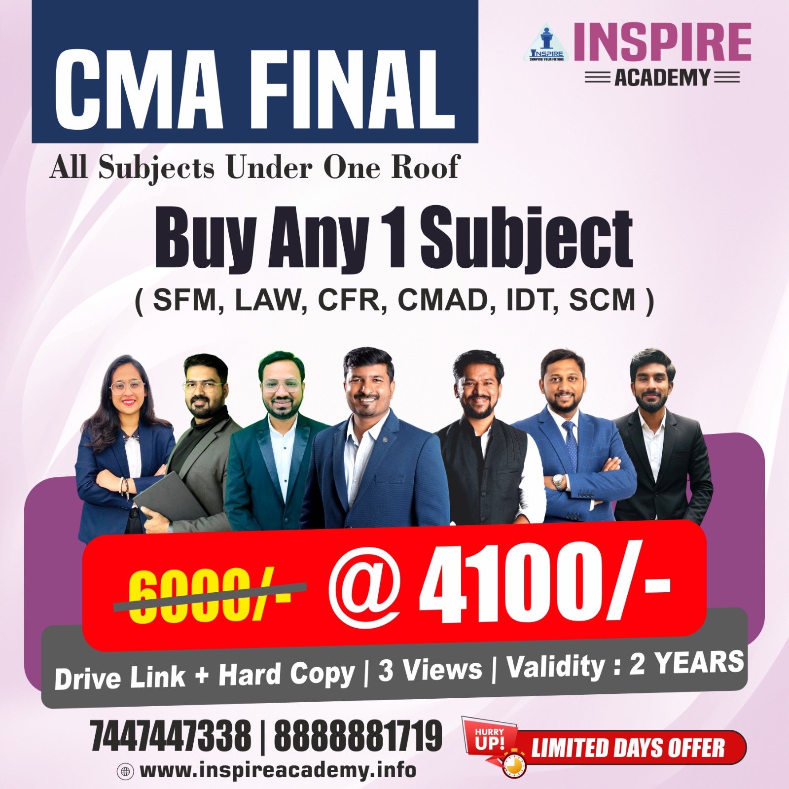 Upon registration, you will receive the CMA Final study material from Inspire Academy. We provide both hard copies and online resources based on your preference.